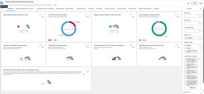 A discovery board in Workday was developed to include key quantitative metrics that support tracking progress against Suncor’s I&D objectives. The discovery board was designed with an overview tab to display representation by different segments on one tab and additional quantitative metrics for a deeper dive into key areas of interest for each of the different segments on their respective tabs. Among other fields, the ability to filter to different areas of the org structure was also built into each tab. Some filters were added with the intent to be transparent for important fields like ‘leave type’ that specific consumers might want to adjust.